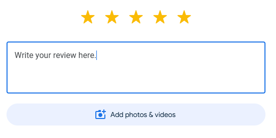 Log in to your Google account or create an account, if you wish. You can review us on Google here. A box should pop up. Click the button that says "Write a review".